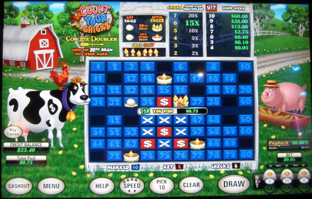 काउंट योर चिक्स एक कीनो-आधारित गेम है जो U1 गेमिंग द्वारा निर्मित मल्टी-गेम मशीनों पर उपलब्ध है। मैंने लास वेगास क्लब, रैम्पर्ट और डॉटीज़ कैसिनो में ऐसी मशीनें देखी हैं। काउंट योर चिक्स की खासियत यह है कि इस गेम में खिलाड़ी द्वारा न चुनी गई पाँच संख्याओं पर एक अंडा बेतरतीब ढंग से रखा जाता है। अगर 20 गेंदों का ड्रॉ उनमें से किसी एक से मेल खाता है, तो अंडों से चूज़े निकलते हैं। दो या उससे ज़्यादा चूज़ों के निकलने पर खिलाड़ी को एक गुणक मिलता है। 20वीं गेंद के लिए विशेष नियम लागू होते हैं।