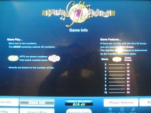 गोल्डन हिट्स एक कीनो-आधारित गेम है जो U1 गेमिंग द्वारा निर्मित मल्टी-गेम मशीनों पर उपलब्ध है। मैंने लास वेगास क्लब, रैम्पर्ट, एल कॉर्टेज़ और डॉटीज़ कैसिनो में ऐसी मशीनें देखी हैं। गोल्डन हिट्स की खासियत यह है कि अगर खिलाड़ी को कोई हिट नहीं मिलती, तो गेम खिलाड़ी द्वारा चुनी गई गेंदों की संख्या के अनुसार 16-24 और गेंदें चुनता है।
