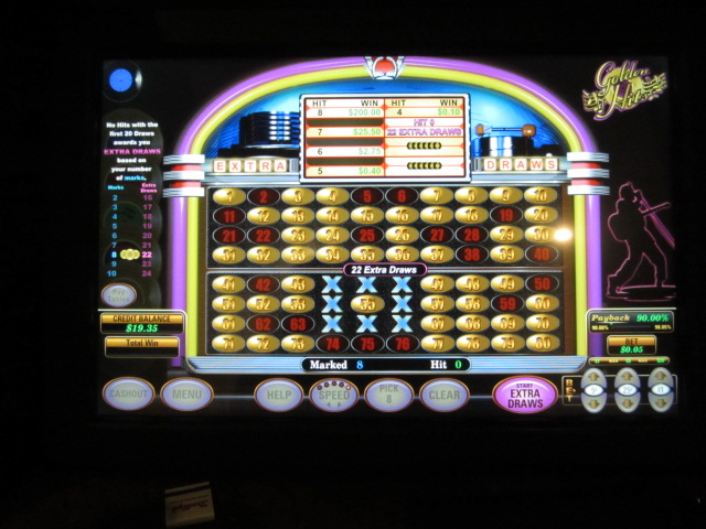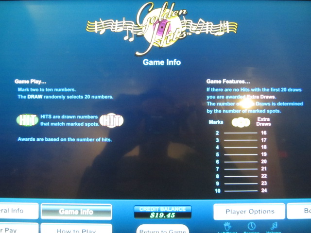 गोल्डन हिट्स एक कीनो-आधारित गेम है जो U1 गेमिंग द्वारा निर्मित मल्टी-गेम मशीनों पर उपलब्ध है। मैंने लास वेगास क्लब, रैम्पर्ट, एल कॉर्टेज़ और डॉटीज़ कैसिनो में ऐसी मशीनें देखी हैं। गोल्डन हिट्स की खासियत यह है कि अगर खिलाड़ी को कोई हिट नहीं मिलती, तो गेम खिलाड़ी द्वारा चुनी गई गेंदों की संख्या के अनुसार 16-24 और गेंदें चुनता है।