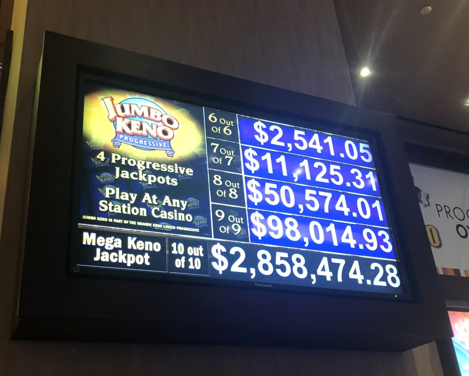 लास वेगास के स्टेशन्स कैसिनो पाँच प्रगतिशील कीनो खेल प्रदान करते हैं। इनमें से चार, पिक-6, पिक-7, पिक-8 और पिक-9, "जंबो केनो प्रोग्रेसिव" खेल कहलाते हैं। पाँचवाँ, पिक-10 खेल, मेगा 10 कहलाता है। नियम कार्ड से पता चलता है कि मेगा 10 सिर्फ़ स्टेशन कैसिनो तक ही सीमित नहीं है, बल्कि नेवादा में अन्य जगहों पर भी उपलब्ध है। सभी जंबो प्रोग्रेसिव खेल केवल $1 के दांव के लिए हैं और मेगा 10 $1.50 का है।