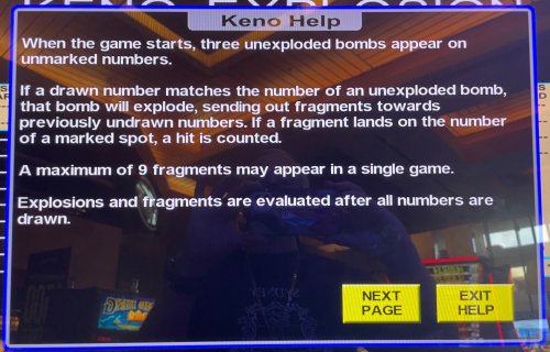 केनो एक्सप्लोजन, IGT द्वारा निर्मित एक केनो संस्करण है। इसमें खिलाड़ी द्वारा चुने गए तीन नंबरों पर बम रखे जाते हैं। अगर गेंद का ड्रॉ बम के नंबर से मेल खाता है, तो वह फट जाएगा और अगर विस्फोट का कोई टुकड़ा खिलाड़ी द्वारा चुने गए नंबर पर लगता है, तो उसे हिट माना जाएगा।