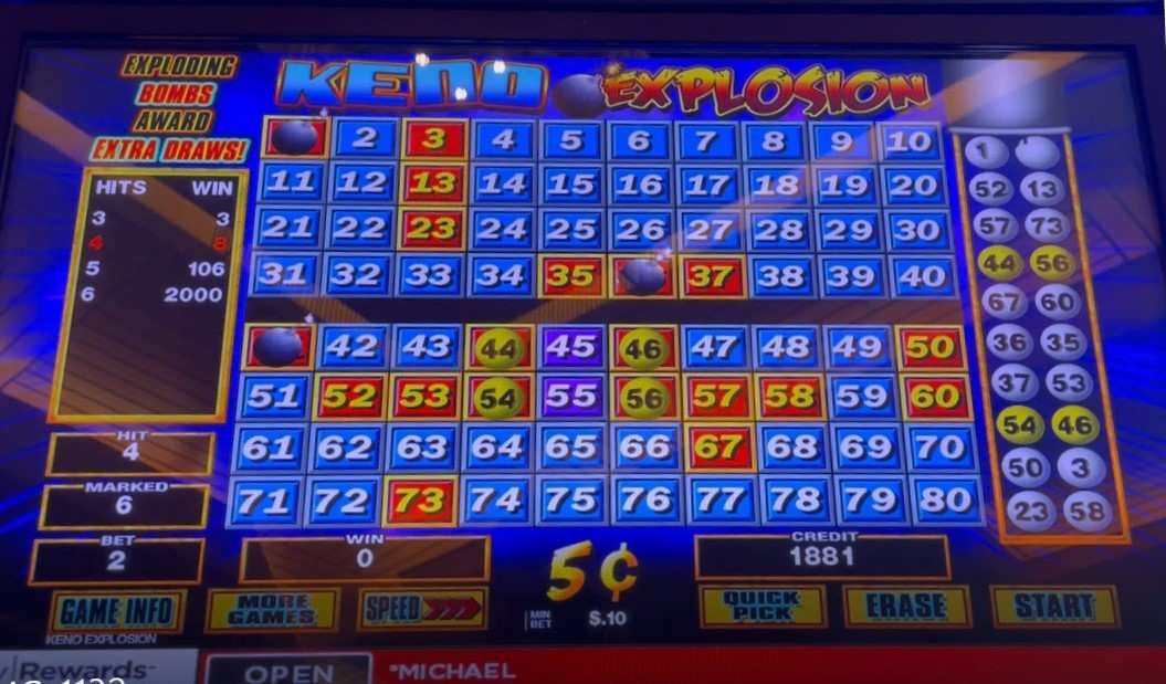 नीचे दी गई तस्वीर एक खेल दिखाती है जिसमें मैंने छह नंबर चुने - 44, 45, 46, 54, 55 और 56। बम 1, 36 और 41 पर रखे गए थे। यह तस्वीर गेंद निकालने के बाद, लेकिन बम फटने से पहले ली गई थी। ध्यान दें कि बम फटने से पहले, मैंने अपने छह में से चार नंबर पकड़ लिए थे, जिससे मुझे 8 की जीत मिली।