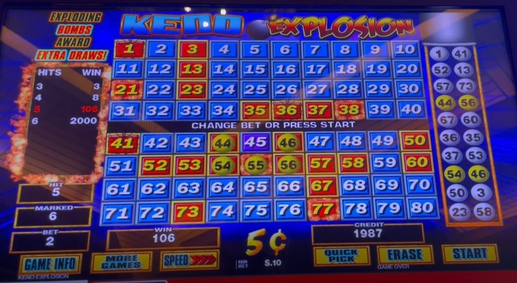 - अगर खेल में गेंद का ड्रॉ बम से चिह्नित तीन संख्याओं में से किसी एक से मेल खाता है, तो वह बम फट जाएगा। विस्फोट के बाद, एक से तीन टुकड़े उन 57 संख्याओं में से किसी एक पर गिरेंगे जो खेल में नहीं चुनी गई हैं या बम से चिह्नित नहीं हैं।