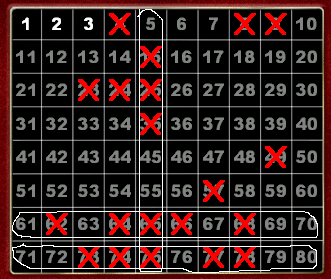 - स्तंभ : ऊपर और नीचे जाने वाली एक सीधी रेखा, उदाहरण के लिए जो संख्या 3, 13, 23, 33, 43, 53, 63 और 73 को कवर करती है।