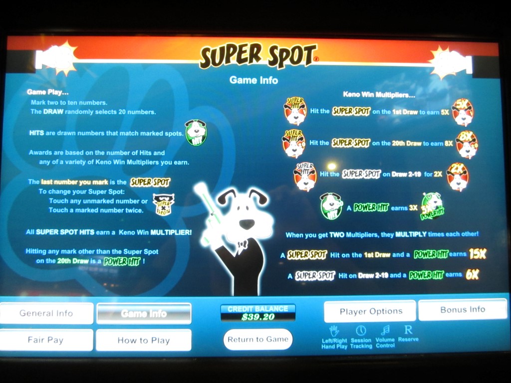 सुपर स्पॉट एक केनो-आधारित गेम है जो U1 गेमिंग द्वारा निर्मित मल्टी-गेम मशीनों पर उपलब्ध है। मैंने लास वेगास क्लब, रैम्पर्ट और डॉटीज़ कैसिनो में ऐसी मशीनें देखी हैं। सुपर स्पॉट, पावर केनो जैसा ही है, सिवाय इसके कि इसमें दो संभावित गुणक हैं: एक चुने गए अंतिम नंबर पर हिट करने के लिए और दूसरा अंतिम गेंद पर किसी भी चीज़ पर हिट करने के लिए।