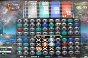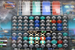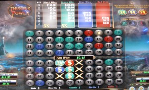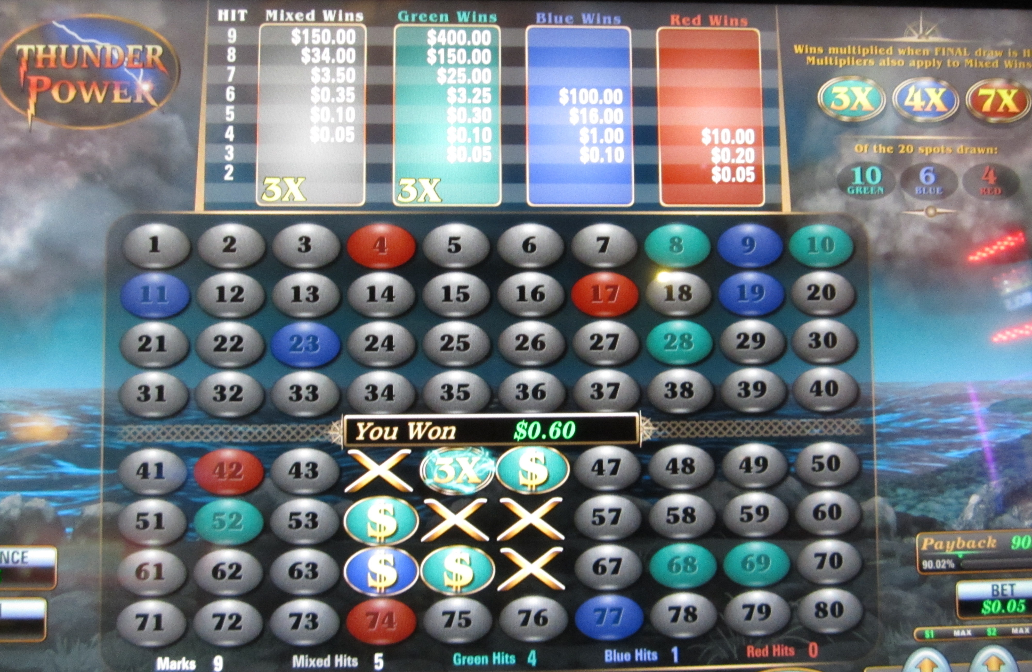 थंडर पावर एक कीनो-आधारित गेम है जो U1 गेमिंग द्वारा निर्मित मल्टी-गेम मशीनों पर उपलब्ध है। मैंने लास वेगास क्लब, रैम्पर्ट, एल कॉर्टेज़ और डॉटीज़ कैसिनो में ऐसी मशीनें देखी हैं। थंडर पावर की खासियत यह है कि इस गेम में अलग-अलग रंग की गेंदें निकाली जाती हैं, और हर रंग की गेंदों की संख्या और रंगों के मिश्रण के आधार पर, जीतने के चार अलग-अलग तरीके होते हैं।