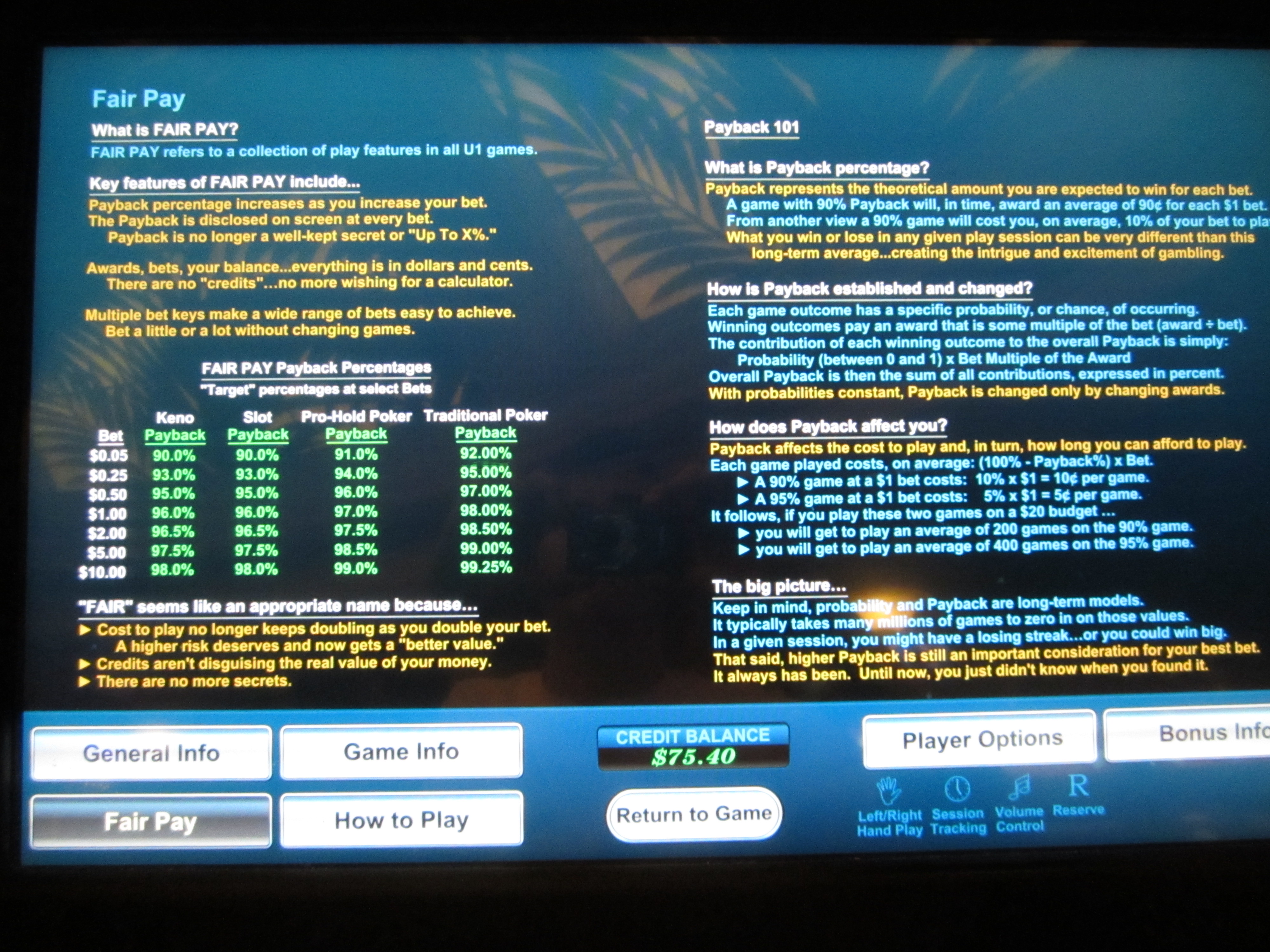 निम्न तालिका खेल श्रेणी और दांव की राशि के अनुसार लक्षित रिटर्न दर्शाती है। अधिकांश मामलों में, वास्तविक रिटर्न 0.03% या उससे अधिक भिन्न हो सकता है। पिक-2 केनो के लिए, यह अधिक भिन्न होता है, क्योंकि रिटर्न को बेहतर बनाने के लिए कम भुगतान होते हैं। रिटर्न में एक यादृच्छिक बोनस गेम शामिल है, जो कुल रिटर्न में 0.5025% का योगदान देता है।