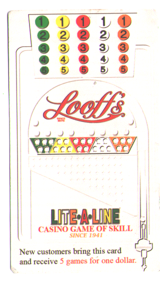 लाइट-ए-लाइन पिनबॉल और बिंगो का एक संयोजन है। यह पिनबॉल जैसा है क्योंकि इसमें आप बोर्ड पर गेंद को प्लंजर से मारते हैं, लेकिन यह बिंगो जैसा भी है क्योंकि आप चाहते हैं कि गेंद लगातार पाँच स्थानों पर दिखाई दे ताकि आप जीत सकें। जैसे ही गेंद बोर्ड पर 25 छेदों से होकर गिरती है, पाँच-बाय-पाँच स्कोरकार्ड पर संबंधित ग्रिड प्रकाशित हो जाते हैं। खिलाड़ी आमतौर पर $1 का दांव लगाते हैं, जिसमें विजेता $15 कमाता है।