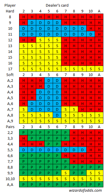 यह मूल रणनीति भुगतान तालिका 2 के लिए है। भुगतान तालिका 1 के साथ एकमात्र अंतर यह है कि 6 के खिलाफ सॉफ्ट 19 पर खड़ा होना है, जो दोगुना करने के विपरीत है।