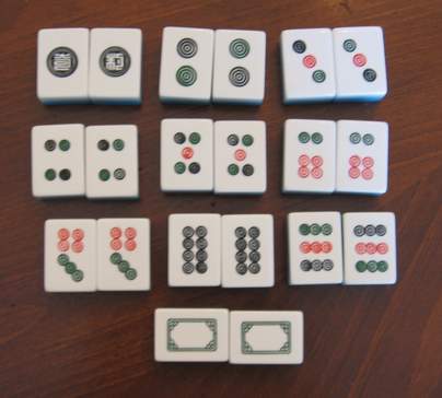 - 20 टाइलों में से, दो टाइलें ऐसी हैं जिन पर 1 से 9 तक अंक अंकित हैं। आखिरी दो टाइलों को "विंडो" टाइल कहा जाता है, और ये दस-बिंदु वाली टाइल के बराबर होती हैं।