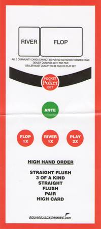 पॉकेट पोकर एक वैकल्पिक साइड बेट है जो तभी भुगतान करता है जब खिलाड़ी के दो पॉकेट कार्ड एक जोड़ी, स्ट्रेट या स्ट्रेट फ्लश हों। अगर खिलाड़ी फोल्ड भी कर देता है, तब भी वह पॉकेट पोकर बेट जीतने का हकदार होता है। नीचे दी गई तालिका बेट की भुगतान तालिका और प्रत्येक विजेता हाथ में कार्ड बाँटने की संभावना दर्शाती है। निचले दाएँ सेल में 2.41% का हाउस एज दिखाया गया है।