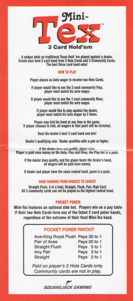मिनी-टेक्स एक टेक्सास-होल्डम शैली का खेल है जो डीलर के विरुद्ध खेला जाता है। इस खेल का उद्देश्य दो पॉकेट कार्ड और तीन कम्युनिटी कार्ड का उपयोग करके डीलर से बेहतर तीन-कार्ड पोकर हाथ बनाकर जीतना है।