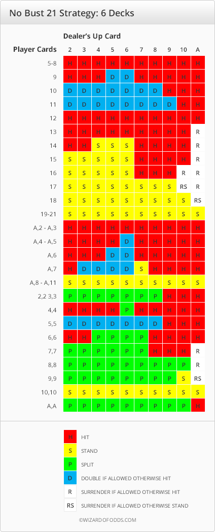 नीचे दी गई तालिका छह-डेक गेम के आधार पर किसी भी हाथ को खेलने का तरीका दिखाती है। खिलाड़ी का हाथ बाएँ कॉलम में है और डीलर का अप कार्ड सबसे ऊपरी पंक्ति में है।