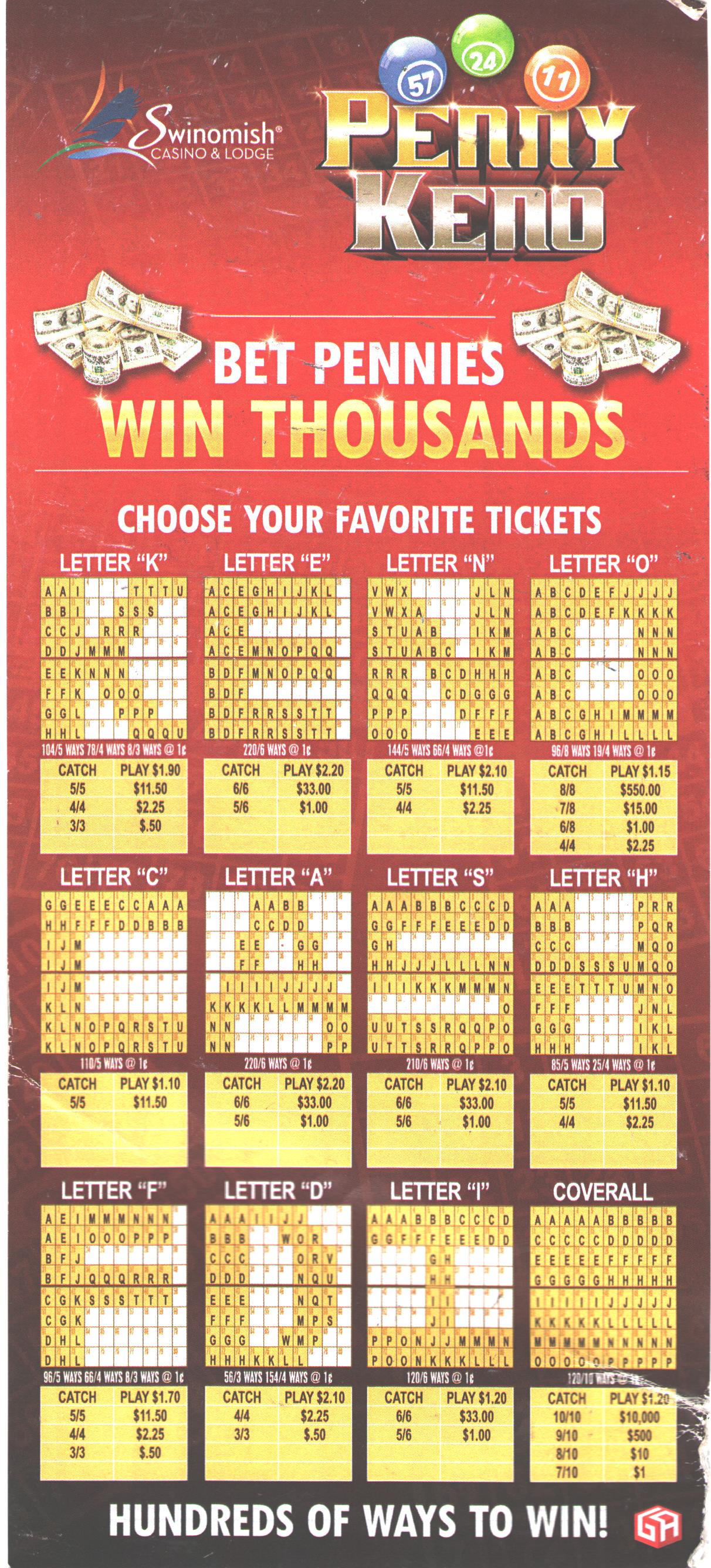 पेनी केनो, मल्टी-कार्ड केनो खेलने का एक ऐसा प्रारूप है जिसे मैंने जुलाई 2023 में वाशिंगटन के एनाकोर्टेस स्थित स्विनोमिश कैसीनो में देखा था। यह मूलतः एक सामान्य केनो ही है, सिवाय इसके कि खिलाड़ी एक बार में 110 से 220 कार्ड $0.01 में खरीदता है। इस खेल में खिलाड़ी को अपने कार्डों की व्यवस्था के अनुसार 12 पैटर्न चुनने की सुविधा मिलती है।