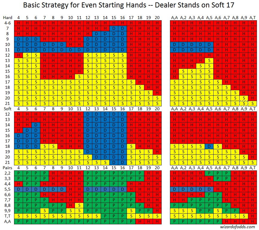 निम्नलिखित मूल रणनीति सम संख्या वाले प्रारंभिक हाथों के लिए है, जहां ऑड्स विन दांव खेल में नहीं है, और डीलर सॉफ्ट 17 पर खड़ा है ।
