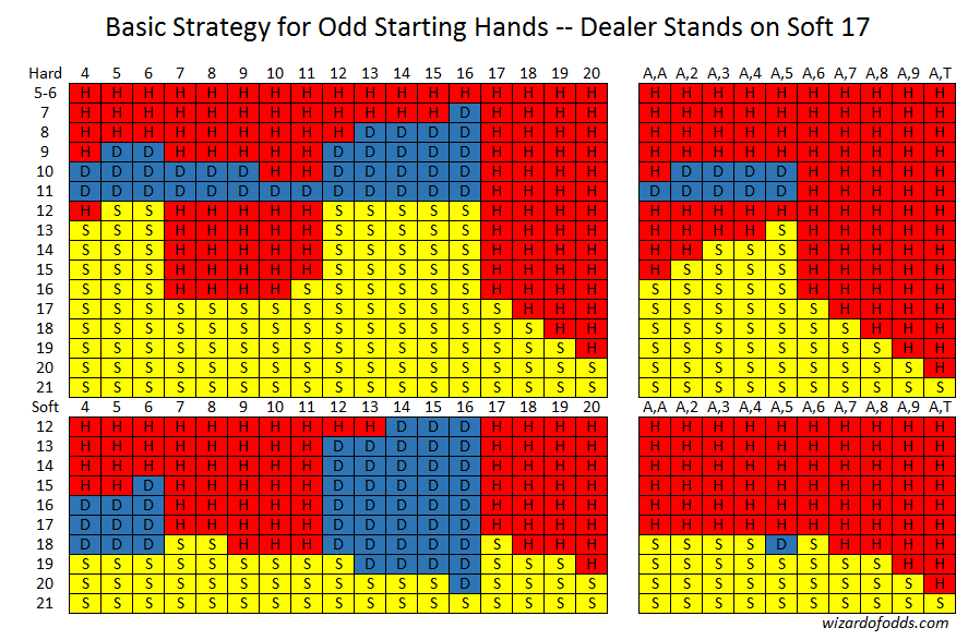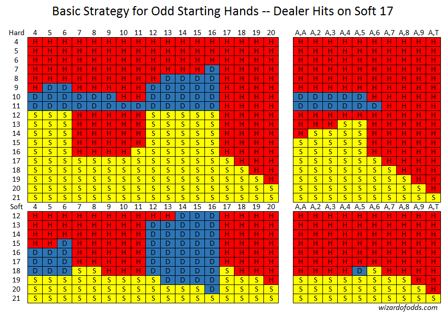 निम्नलिखित बुनियादी रणनीति विषम संख्या वाले शुरुआती हाथों के लिए है, जहां ऑड्स विन दांव अभी भी खेल में है, और डीलर सॉफ्ट 17 पर खड़ा है । अंतिम बुनियादी रणनीति तालिका के बाद एक कुंजी दी गई है।