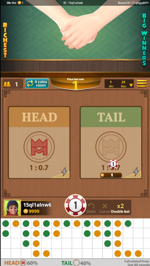 - खिलाड़ी हेड या टेल पर दांव लगा सकता है।