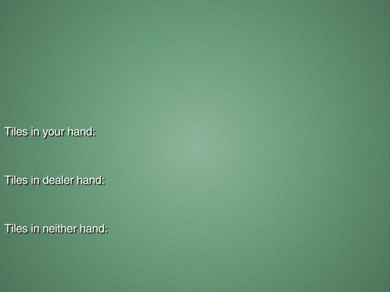 - किसी विशिष्ट हाथ का विश्लेषण करने के लिए, जहां आपने डीलर की टाइलों में से एक को देखा हो, अपनी चार टाइलें और डीलर की टाइल जो आपने देखी हो, उसे दर्ज करें।
