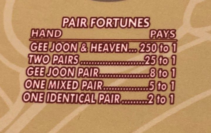 पेयर फॉर्च्यून्स, पाई गो टाइल्स के लिए उपलब्ध कुछ साइड बेट्स में से एक है। अगर खिलाड़ी को कम से कम एक जोड़ी मिलती है, तो वह जीत जाता है। दो के लिए वह और भी ज़्यादा जीतता है। मेरी जानकारी के अनुसार, इस खेल के लिए तीन पे टेबल हैं, जो इस प्रकार हैं: