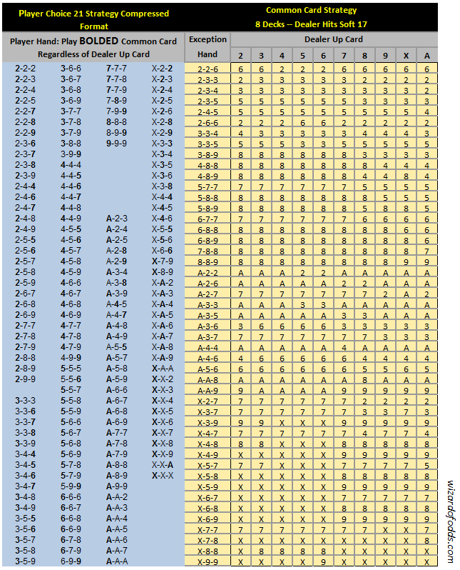 यहां ऊपर दी गई तालिका का संक्षिप्त संस्करण दिया गया है, जिसमें उन सभी हाथों को सम्मिलित किया गया है जो दाईं ओर दिए गए डीलर कार्ड पर निर्भर नहीं हैं।