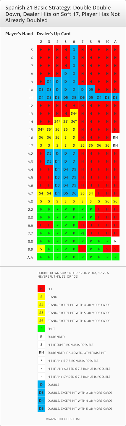 निम्नलिखित तालिका प्लेयर्स एज 21 के लिए मूल रणनीति दर्शाती है, जो स्पैनिश 21 के लिए वही है जब पुनः दोहरीकरण की अनुमति है।