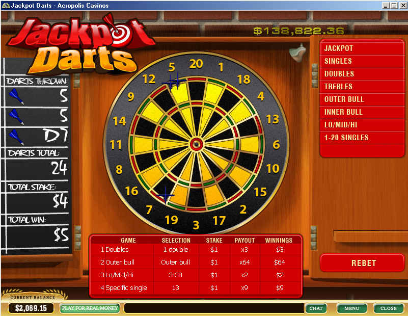 उपरोक्त स्क्रीनशॉट में मैंने $1 का दांव लगाया कि ठीक एक डार्ट दोहरे सर्कल में गिरेगा (जिससे $3 जीते), $1 का दांव लगाया कि कम से कम एक डार्ट बाहरी बुल्सआई पर लगेगा (जिससे हार गए), $1 का दांव 3 से 38 के कुल योग पर लगाया (जिससे $2 जीते), तथा $1 का दांव संख्या 13 पर लगाया (जिससे हार गए)।