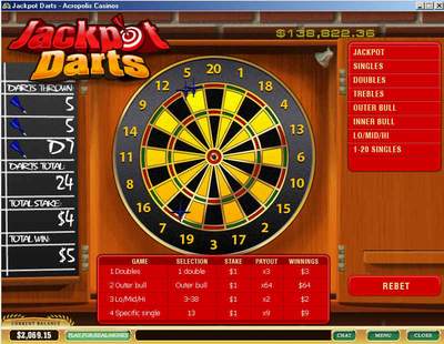जैकपॉट डार्ट्स एक ऐसा गेम है जो प्लेटेक सॉफ्टवेयर का इस्तेमाल करके इंटरनेट कैसीनो में उपलब्ध है। यह गेम आर्केड गेम्स मेनू में उपलब्ध है।