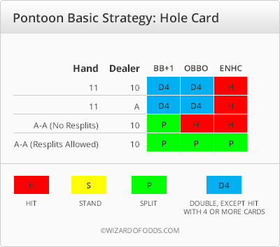 यूरोपीय नो-होल-कार्ड नियम पोंटून में खिलाड़ी के पक्ष में है। ऐसा इसलिए है क्योंकि 21 अंक वाला खिलाड़ी स्वतः ही जीत जाता है, भले ही डीलर को ब्लैकजैक मिले। अमेरिकी स्पेनिश 21 में, डीलर का ब्लैकजैक खिलाड़ी के ब्लैकजैक को छोड़कर किसी भी चीज़ को हरा देता है, जिससे खिलाड़ी की संभावना कम हो जाती है।
