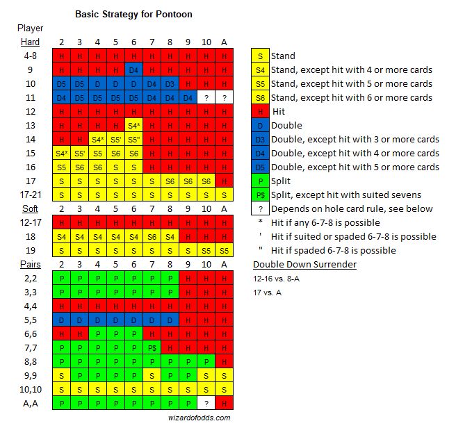 जब खिलाड़ी डबल या स्प्लिट करता है, और डीलर को ब्लैकजैक मिलता है, तो क्या होता है, यह इस बात पर निर्भर करता है कि आप किस कैसीनो में हैं। ज़्यादातर मामलों में, ऑस्ट्रेलिया के अलावा दुनिया में कहीं और पालन किए जाने वाले नियम नहीं मिलते, इसलिए नई शब्दावली विकसित करनी पड़ी। पोंटून और ब्लैकजैक पर अन्य स्रोत मेरे जैसी शब्दावली का इस्तेमाल नहीं करते, या उन्हें अलग तरह से इस्तेमाल करते हैं। मैंने कैटरीना वॉकर की किताब "द प्रोज़ गाइड टू स्पैनिश 21 एंड ऑस्ट्रेलियन पोंटून" में इस्तेमाल किए गए शब्दों का इस्तेमाल करने का फैसला किया है। कृपया मुझे यह लिखकर न बताएं कि मैंने किसी और वेबसाइट का हवाला देते हुए शब्दावली गलत लिखी है। पोंटून को वॉकर से बेहतर कोई नहीं जानता, इसलिए मैं मापने के लिए इससे बेहतर कोई मानक नहीं सोच सकता।