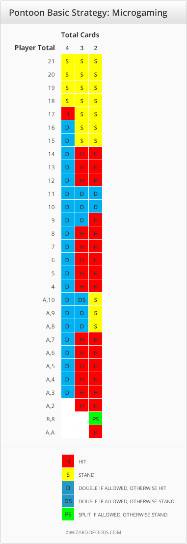इस रणनीति का इस्तेमाल करने के लिए, बाईं ओर खिलाड़ी के हाथ और ऊपर की ओर पत्तों की संख्या देखें। रणनीति का ऊपरी हिस्सा हार्ड टोटल के लिए और निचला हिस्सा सॉफ्ट हैंड के लिए है। खिलाड़ी को हमेशा आठों को विभाजित करना चाहिए। खिलाड़ी को ऊपर दिए गए उदार इक्का विभाजन नियमों के तहत इक्कों को विभाजित करना चाहिए, लेकिन माइक्रोगेमिंग नियमों के तहत नहीं, या काल्पनिक रूप से, अगर इक्कों को विभाजित करने के बाद इक्का और 10 एक पोंटून नहीं था।