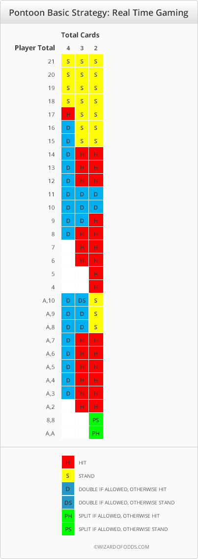 निम्नलिखित तालिकाएँ RTG, Playtech, Galewind, Betsoft और Cryptologic नियमों के तहत पोंटून के लिए बुनियादी रणनीति दर्शाती हैं। Betsoft इस्तेमाल किए गए डेक की संख्या नहीं बताता है, लेकिन वे अपने सभी मानक ब्लैकजैक खेलों में छह डेक का उपयोग करते हैं।