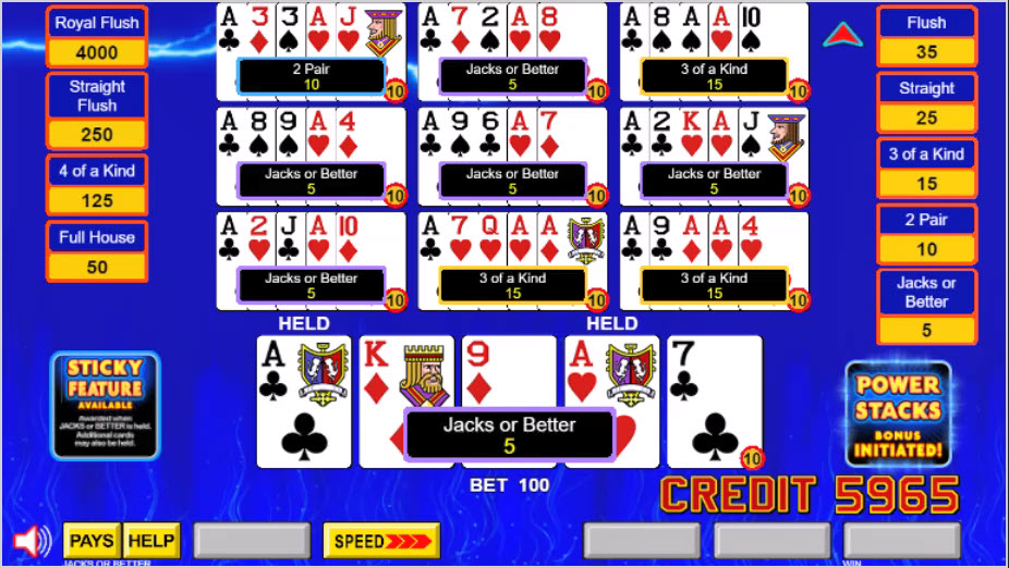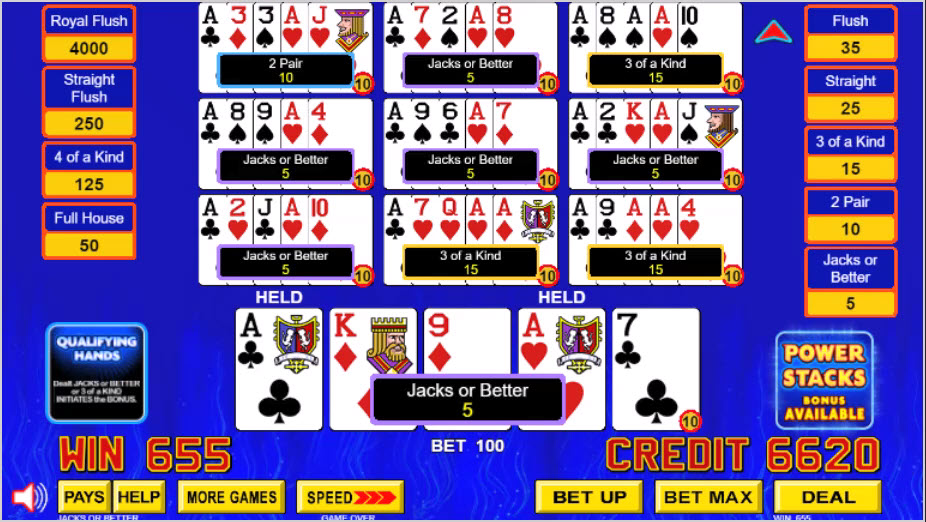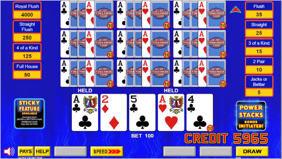 - यदि पावर स्टैक सुविधा सक्षम है, तो खिलाड़ी को जैक की जोड़ी या उससे बेहतर या एक तरह के तीन कार्ड मिलने पर वह इस सुविधा को खेलेगा।