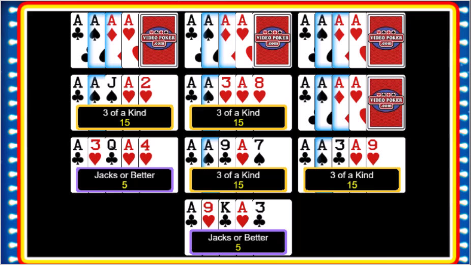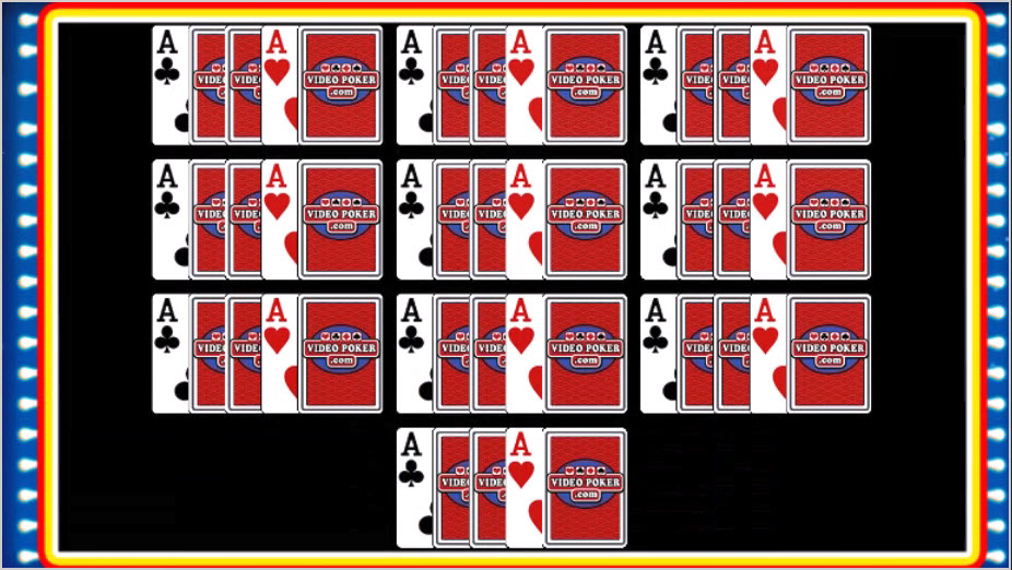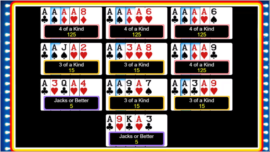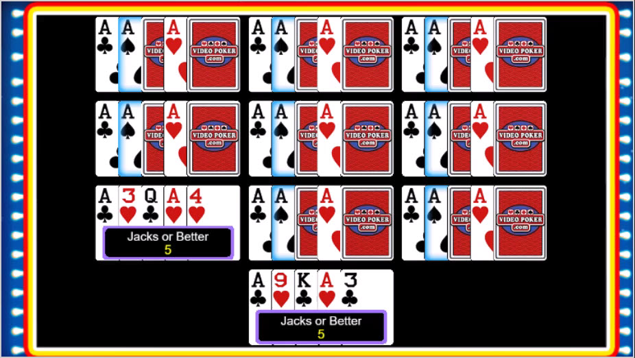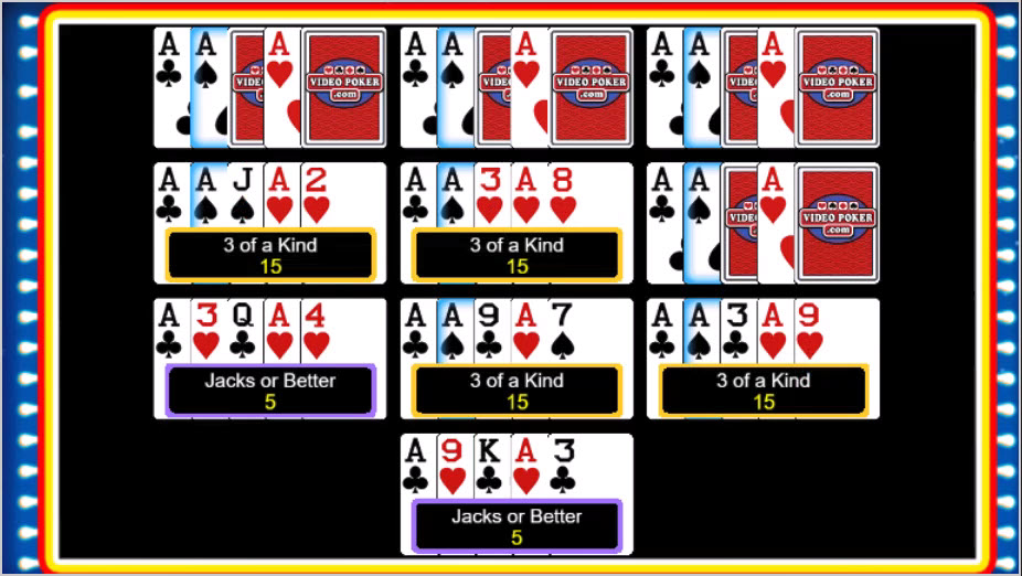 जिन 10 हाथों के लिए मैंने भुगतान किया, उनमें मेरे इक्कों की जोड़ी एक बार दो जोड़ी और तीन बार एक जैसे तीन में बदली। प्रति खेल 5 सिक्कों के दांव के आधार पर, इन हाथों पर कुल जीत 5 * (6*1 + 1*2 + 3*3) = 85 है।