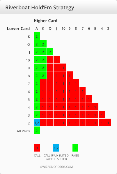 निम्नलिखित तालिका खिलाड़ी के शुरुआती दो कार्डों के आधार पर सर्वोत्तम रणनीति दर्शाती है। फोल्ड करने का कोई कोड नहीं है क्योंकि खिलाड़ी को ऐसा कभी नहीं करना चाहिए।