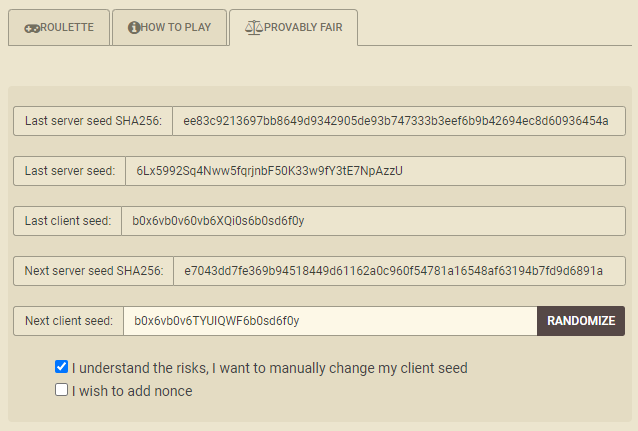 यह आप पर निर्भर है कि आप नॉन्स जोड़ना चाहते हैं या नहीं, जो क्लाइंट सीड के अंत में जोड़े गए अतिरिक्त स्वचालित वर्ण होते हैं। मेरा मानना है कि अगर कैसीनो का इरादा धोखा देने का होता, तो नॉन्स जोड़ने से कोई सुरक्षा नहीं मिलती।