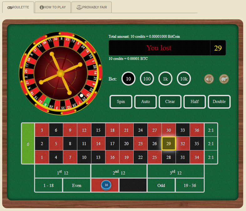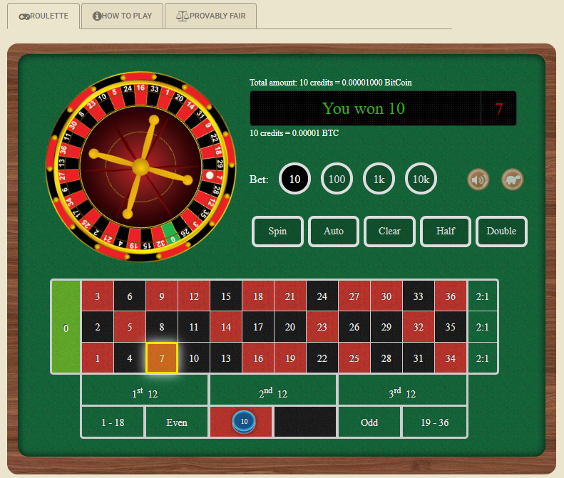 इसके बाद मैंने एक दांव लगाया, जैसा कि ऊपर दिखाया गया है। यहाँ मैंने 10 चिप्स, जिनमें से प्रत्येक का मूल्य 0.000001 BTC (बिटकॉइन) है, लाल रंग पर कुल 0.00001 BTC (लगभग 10¢ के बराबर) का दांव लगाया।