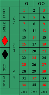 शून्य और दोहरे शून्य की तरह, अगर गेंद हरे रंग में गिरती है तो सभी सम-धन वाले दांव हार जाते हैं। 1 से 36 तक की संख्याओं का क्रम एकल-शून्य रूलेट जैसा ही है। 0, 00 और लोगो सभी क्रमागत हैं, और लोगो बीच में है।