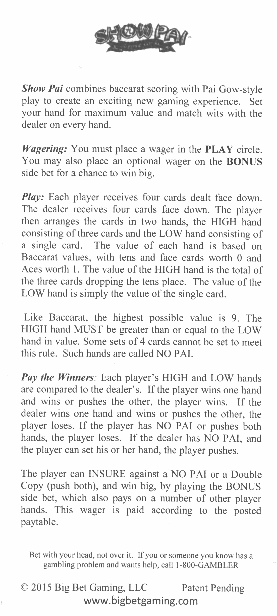 शो पै एक काफी सरल टेबल गेम है जो बैकारेट के स्कोरिंग को पै गो के प्रारूप के साथ जोड़ता है। इस खेल की शुरुआत 2016 की शुरुआत में लास वेगास पैलेस स्टेशन पर हुई थी। यह खेल सीखना और खेलना आसान है और इसमें हाउस एज अपेक्षाकृत कम है।