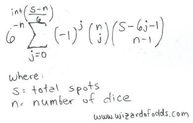 निम्नलिखित n पासों पर s स्पॉट के लिए एक सूत्र है, जो रिचर्ड ए. एपस्टीन द्वारा द थ्योरी ऑफ गैंबलिंग एंड स्टैटिस्टिकल लॉजिक , सूत्र 5-14 से लिया गया है।