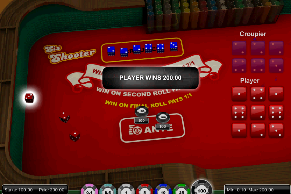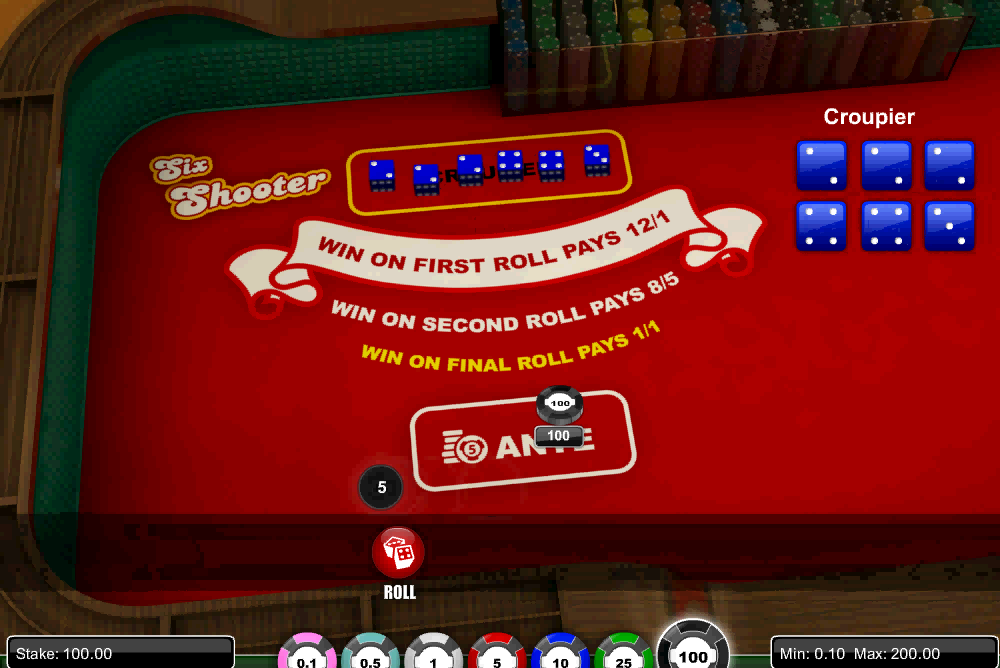 सिक्स शूटर, इंटरनेट कैसीनो के लिए सॉफ्टवेयर प्रदाता, 1x2 द्वारा बनाया गया एक पासा खेल है। इस खेल का उद्देश्य खिलाड़ी द्वारा डीलर रोल में दर्शाए गए प्रत्येक अंक को यथासंभव कम बार फेंकना है।
