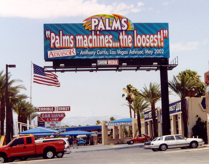 उपरोक्त चिन्ह पाम्स के सामने वाली सड़क पर पाया जा सकता है। हालाँकि मैंने यह अध्ययन किया था, एंथनी कर्टिस ने इसे लास वेगास एडवाइजर में प्रकाशित किया, जिससे यह प्रसिद्ध हो गया। चिन्ह में "..." शब्द काफी जानकारी समेटे हुए है, जिसे सुविधाजनक रूप से चिन्ह से हटा दिया गया था। वास्तव में, अध्ययन में केवल इतना कहा गया है कि लास वेगास में सर्वेक्षण किए गए कैसीनो में पाम्स में सबसे कम निकल वीडियो स्लॉट थे। नीचे दिए गए छोटे अक्षरों में लिखा है, "नवंबर 2001 से फरवरी 2002 के बीच ऑस्टिन पॉवर्स, फॉर्च्यून कुकी, रील'एम इन और व्हील ऑफ फॉर्च्यून गेम्स पर एक स्वतंत्र अध्ययन किया गया। उन्होंने लेपर्डस्पॉट्स को छोड़ दिया, और अध्ययन अक्टूबर में शुरू हुआ।"