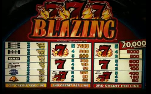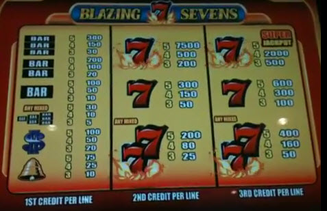 नियम स्क्रीन और गेम ग्लास से भुगतान तालिका आसानी से देखी जा सकती है। ज़्यादातर वीडियो स्लॉट सभी पुरस्कारों को प्रति पंक्ति दांव पर लगाए गए सिक्कों की संख्या से गुणा करते हैं। ब्लेज़िंग सेवन्स अलग है। पहला सिक्का डॉलर, घंटी और सभी बार प्रतीकों पर जीत हासिल करता है। दूसरा सिक्का सभी प्रकार के सेवन्स पर जीत हासिल करता है। तीसरा सिक्का सादे सेवन्स और मिश्रित सेवन्स पर जीत को दोगुना कर देता है, और ब्लेज़िंग सेवन्स पर जीत को दोगुने से भी ज़्यादा कर देता है। निम्नलिखित तीन तालिकाएँ क्रमशः प्रति पंक्ति 1, 2 और 3 सिक्कों के दांव के लिए भुगतान तालिका दिखाती हैं। सभी जीत बाईं ओर संरेखित होनी चाहिए।