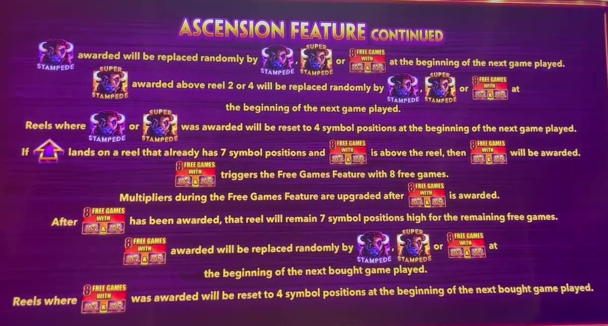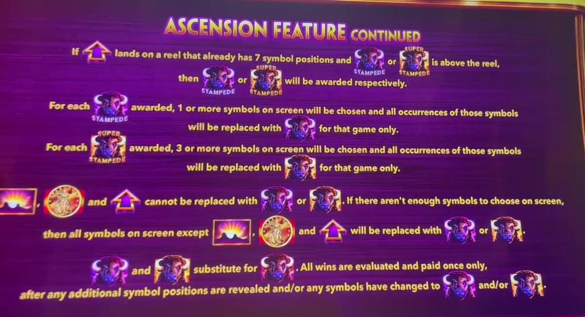बफ़ेलो असेंशन, बफ़ेलो थीम वाले कई खेलों में से एक है। इसकी ख़ासियत यह है कि रीलों 2 से 4 पर दिखाई जाने वाली स्थितियों की संख्या 4 से 7 तक हो सकती है। प्रतीकों का ढेर जितना ऊँचा होगा, जीतने के उतने ही ज़्यादा तरीके होंगे और आप बोनस के उतने ही करीब होंगे।