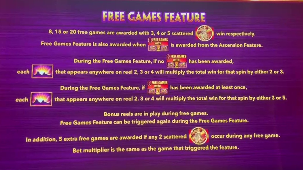 - मुफ़्त स्पिन में, सूर्योदय प्रतीक, वाइल्ड होने के अलावा, 2x या 3x गुणक के साथ भी आएगा, जो उस स्पिन की सभी जीत पर लागू होगा। इसके अलावा, अगर खिलाड़ी 3 से 5 स्वर्ण सिक्कों के साथ बोनस को फिर से ट्रिगर करता है, तो वाइल्ड गुणक शेष सभी स्पिनों के लिए 3x या 5x होगा।