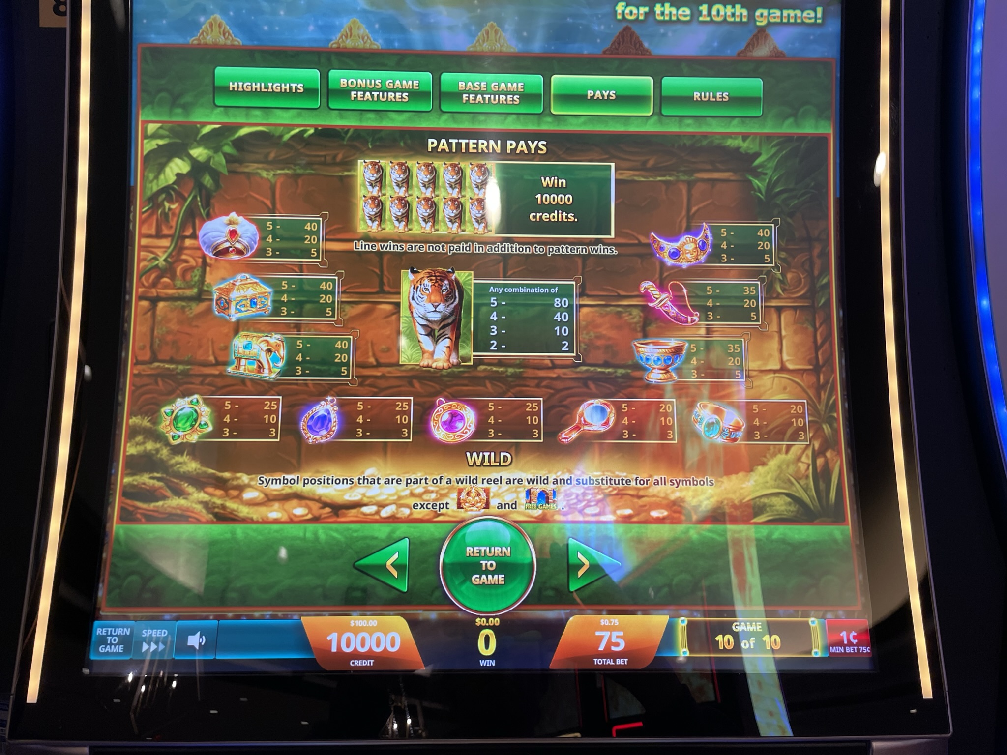 - बाघ एक विशेष प्रतीक है जो लाइन भुगतान के रूप में कार्य नहीं करता है, लेकिन दस का एक ब्लॉक, जिसमें दो पंक्तियां और पांच कॉलम होते हैं, 10,000 क्रेडिट का भुगतान करता है।