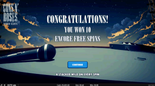 एनकोर फ्री स्पिन्स बोनस में, खिलाड़ी को दस फ्री स्पिन मिलते हैं। कोई भी स्वाभिमानी फ्री स्पिन बोनस, फ्री स्पिन्स को खास बनाता है, और GNR भी इसका अपवाद नहीं है। हर फ्री स्पिन में, गेम एक रैंडम रील को पूरी तरह से वाइल्ड चुनेगा, जैसा कि बैंड के सदस्यों की तीन स्टैक्ड पोजीशन द्वारा दर्शाया गया है। रील और बैंड के सदस्य, दोनों का चयन अन्य रीलों के घूमना बंद करने और उस रील पर ओवरले करने से पहले किया जाता है। इसके अलावा, वह बैंड सदस्य बाकी चार रीलों पर वाइल्ड हो जाएगा।