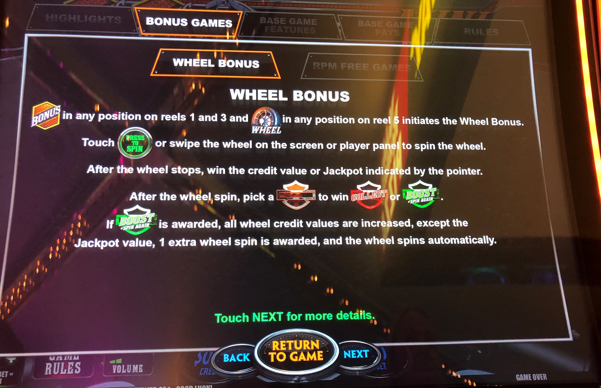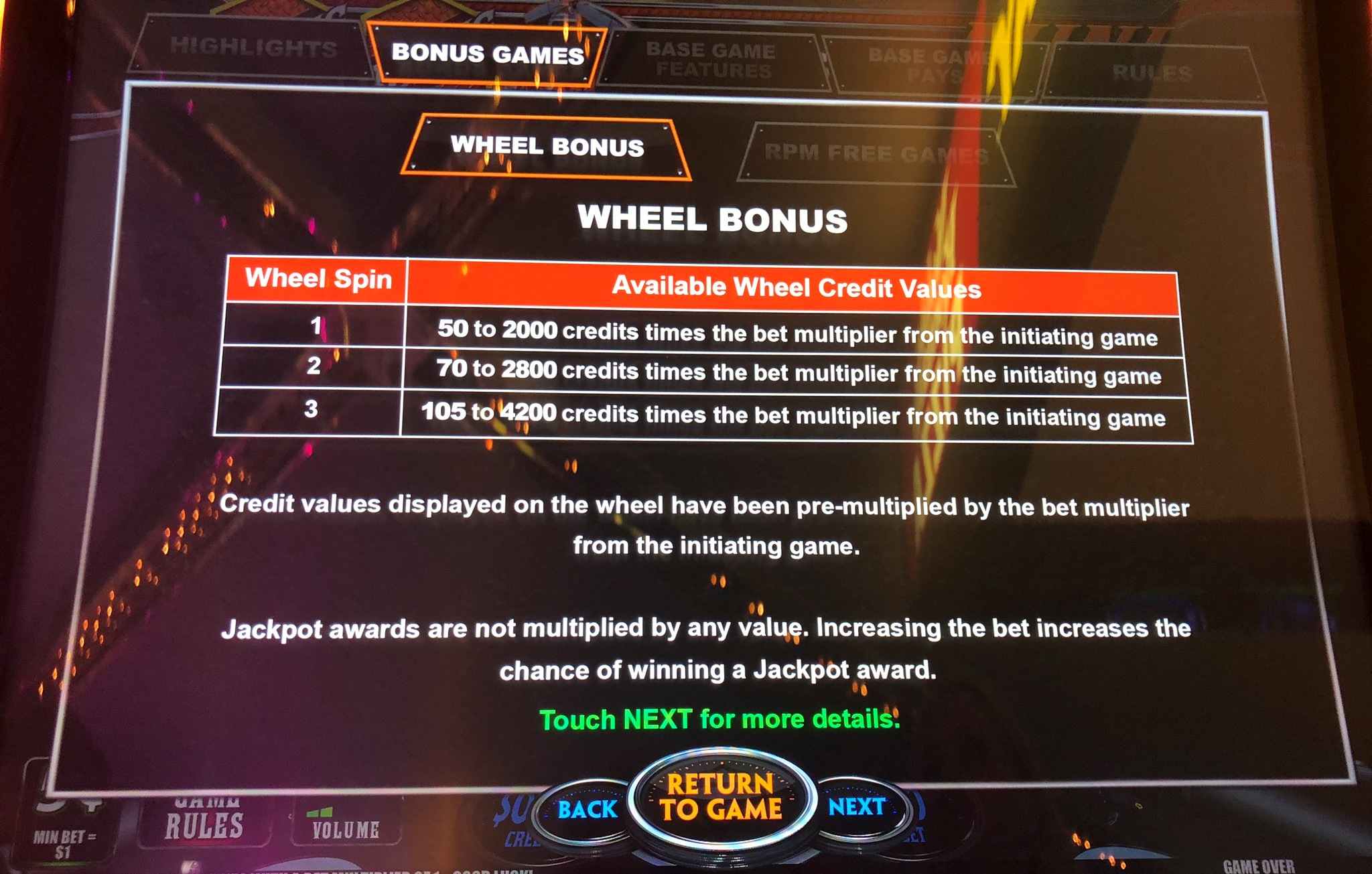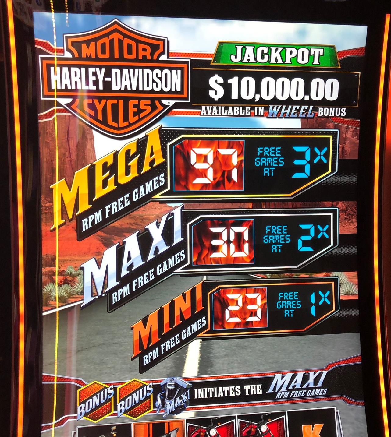 लास वेगास के फोर क्वींस में इस लेख में दिखाई गई मशीन की अधिकतम जीत $10,000 थी। कुछ अन्य हार्ले डेविडसन मशीनों में भी व्हील पर एक प्रोग्रेसिव जैकपॉट स्लाइस होता है। अगर ऐसा है, तो किसी भी समय अपेक्षित मूल्य भी उस प्रोग्रेसिव पर निर्भर करेगा। जैकपॉट राशि का मूल्य पर क्या प्रभाव पड़ता है, मुझे नहीं पता।