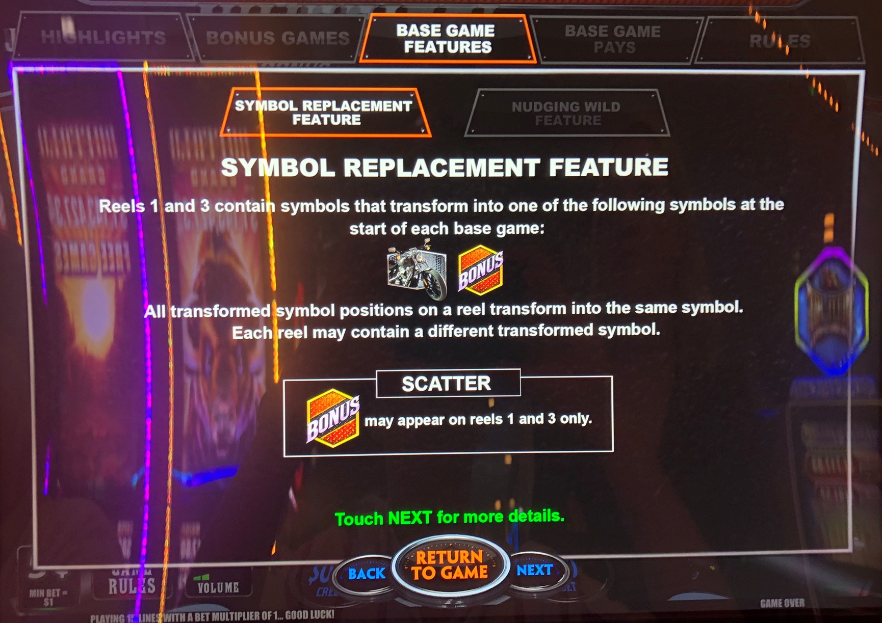 रीलों 1 और 3 पर स्कैटर सिंबल हैं। रील 5 पर बोनस सिंबल हैं। इस गेम में एक "सिंबल रिप्लेसमेंट" सुविधा है, जहाँ विशेष सिंबल, जैसे वाइल्ड, स्कैटर और बोनस सिंबल, बेतरतीब ढंग से अन्य लाइन पे सिंबल की जगह ले लेते हैं। खिलाड़ी जितना ज़्यादा दांव लगाएगा, उतने ही ज़्यादा स्कैटर और बोनस सिंबल दिखाई देंगे।