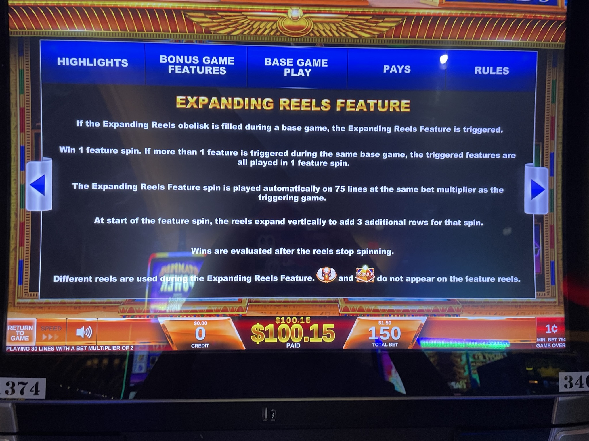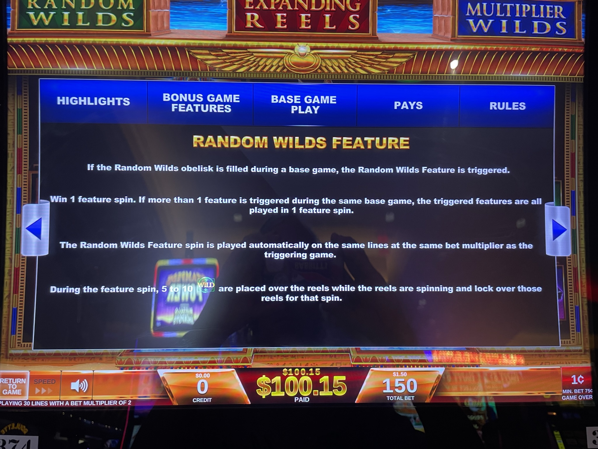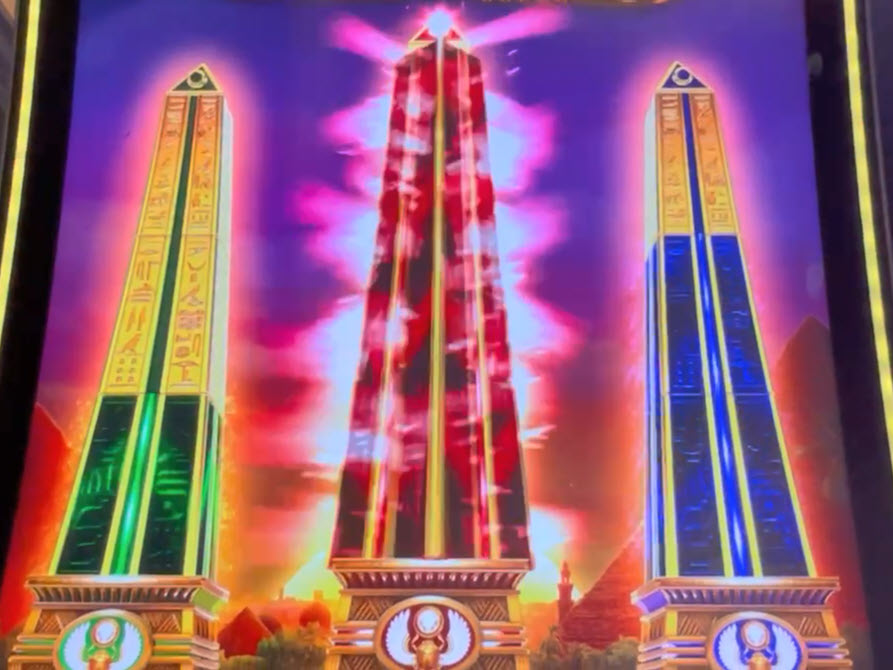 लाल ओबिलिस्क के तीनों टुकड़े पाने पर खिलाड़ी को एक रैंडम वाइल्ड फ़ीचर स्पिन मिलेगा। इस फ़ीचर स्पिन में, रीलों की संख्या तीन पंक्तियों से बढ़कर छह हो जाती है। इससे भी महत्वपूर्ण बात यह है कि पेलाइन्स की संख्या 30 से बढ़कर 75 हो जाती है। मुझे पूरा यकीन है कि रील स्ट्रिपिंग का भी ज़्यादा उदार इस्तेमाल किया गया है।