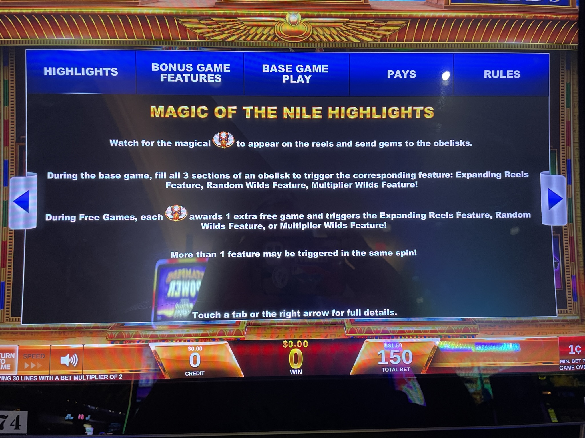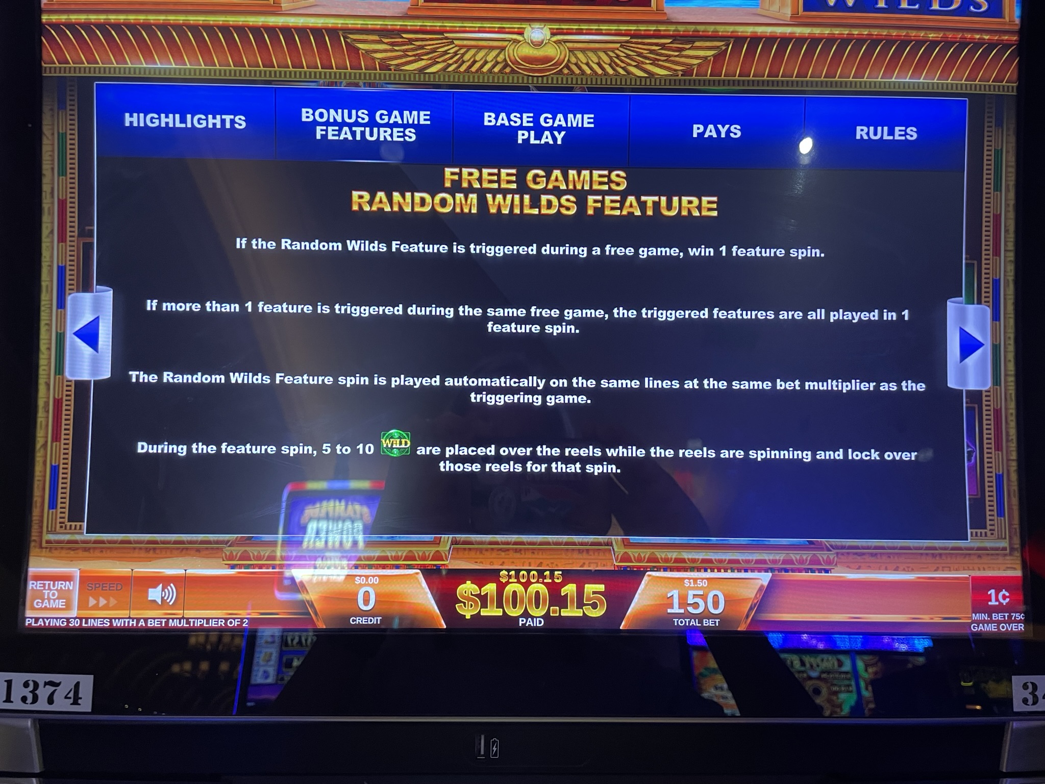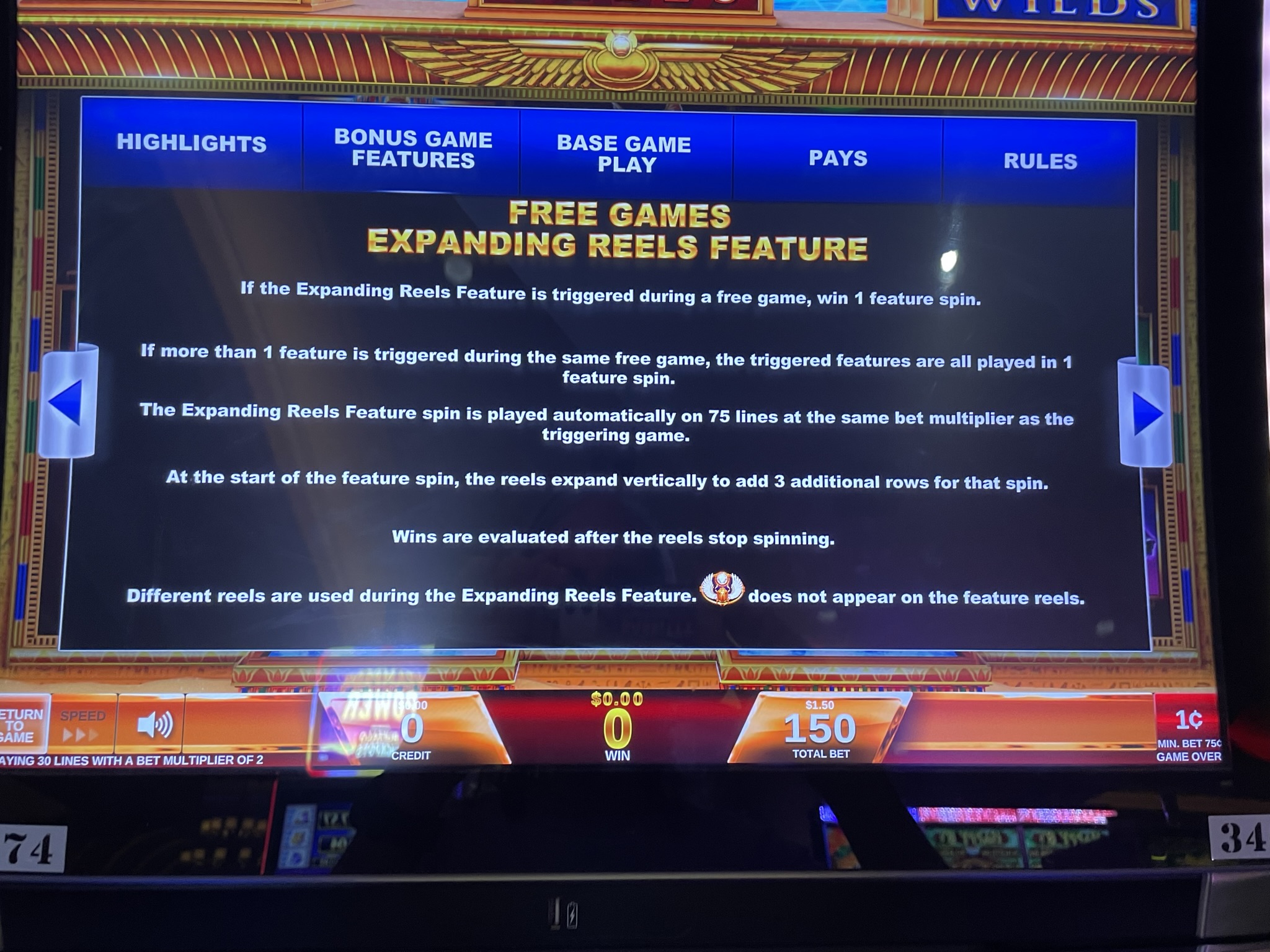 लाल ओबिलिस्क के तीनों टुकड़े पाने पर खिलाड़ी को एक रैंडम वाइल्ड फ़ीचर स्पिन मिलेगा। इस फ़ीचर स्पिन में, रीलों की संख्या तीन पंक्तियों से बढ़कर छह हो जाती है। इससे भी महत्वपूर्ण बात यह है कि पेलाइन्स की संख्या 30 से बढ़कर 75 हो जाती है। मुझे पूरा यकीन है कि रील स्ट्रिपिंग का भी ज़्यादा उदार इस्तेमाल किया गया है।